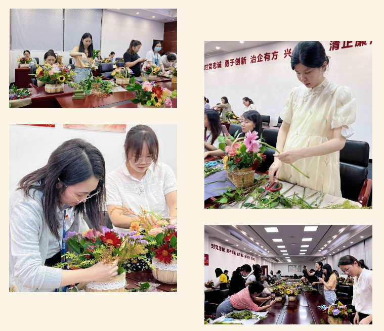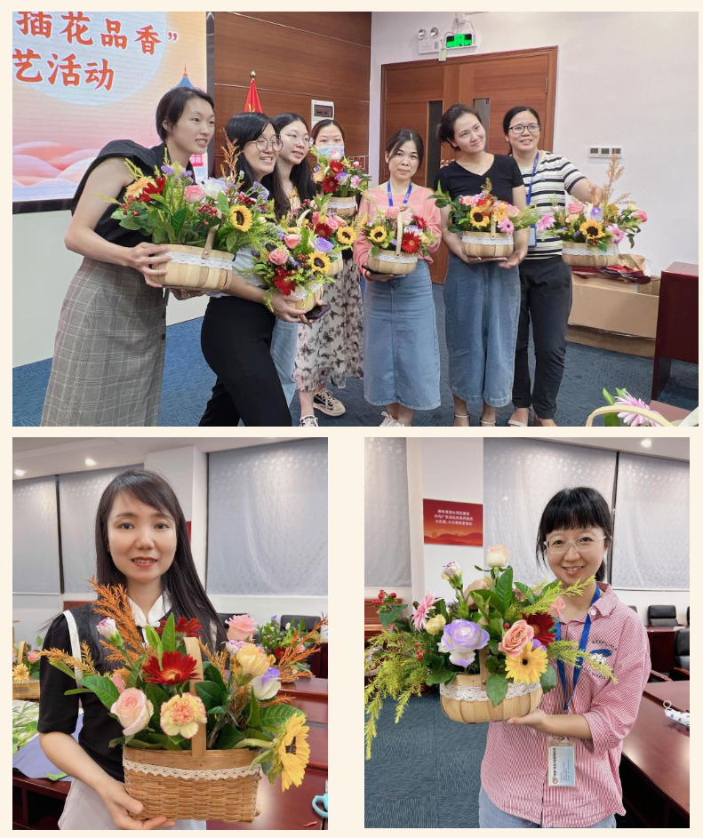 整个活动现场花香满溢,大家热情高涨。经过一个多小时的精心制作,一个个花篮逐渐成型,错落有致、生机盎然,大家看着自己的作品,都充满了成就和喜悦感。活动结束后,大家纷纷拿着自己的插花作品合影留念。