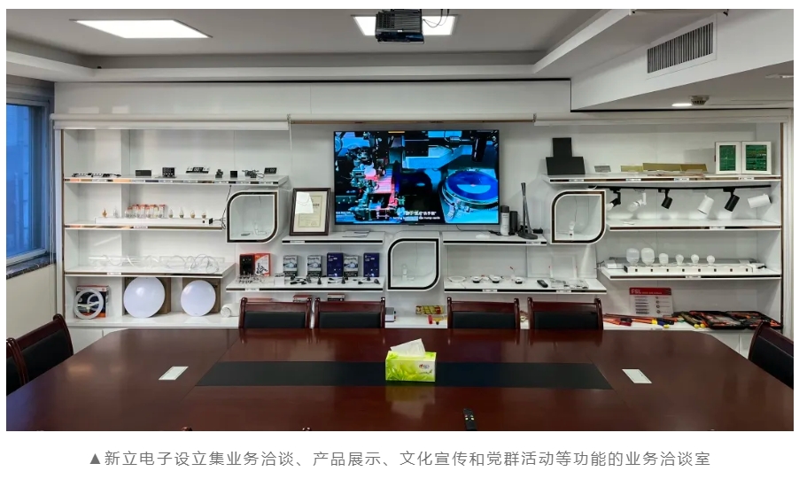 为切实发挥强链补链延链作用,充分展现企业实力优势,新立电子设立集业务洽谈、产品展示、文化宣传和党群活动多维一体功能的“业务洽谈室”,通过样品展柜、多媒体显示设备等形式,打造对外展示“新窗口”,助力公司提升品牌形象、宣传企业文化、拓展业务市场。业务洽谈室的使用,为新立电子促成巴西路灯项目产品销售、佛山照明灯具出口美国、风华产品境内外销售等重点项目落地提供了有力支撑。