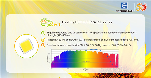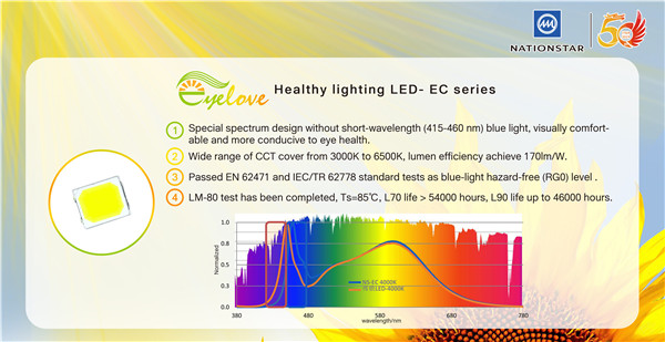 Eyelove™ LED,从光源本质上降低普通光源带来的短波蓝光损伤,减少视觉疲劳,同时,结合活动场景,适宜地调整光谱,保护眼睛、提高视觉舒适度。Eyelove™自然光DL系列主打类太阳光谱,减少了低波段蓝光(415-460 nm)部分,可为更高标准的灯具提供更有优势的光动力。Eyelove™健康光EC系列,主打降低短波蓝光护眼功能,视觉舒适度高,更有利于眼睛健康,色温覆盖3000K-6500K,系列齐全,4014系列光效高达180lm/W。