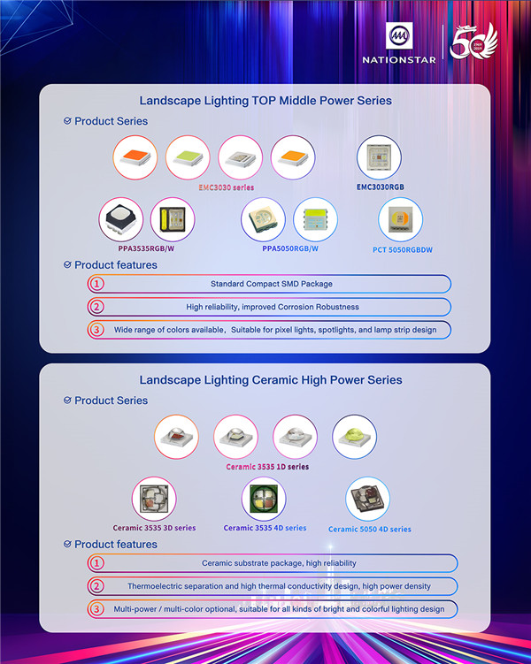 伴随着城市化进程不断深化、城市设施不断升级,文旅灯光、夜游经济、特色小镇建设热潮逐渐兴起,同时受益于全球各个国家或地区政策推广支持,景观亮化市场渗透率不断提高。近年来,永信贵宾会光电积极布局景观照明细分领域,全面打磨从中低功率到高功率,从单色、白光到全彩,全功率、全色系、全平台系列化景观亮化LED产品,为客户提供全场景一站式LED器件解决方案。